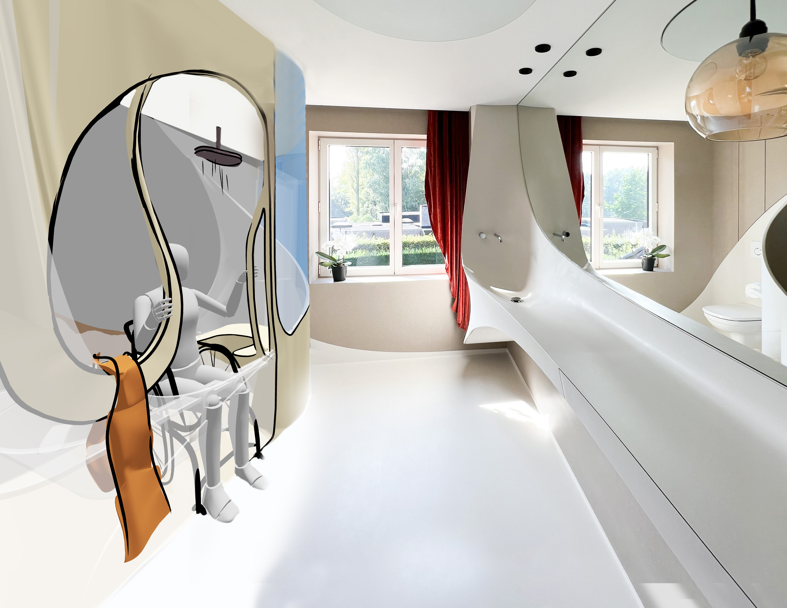 Monica: de digitale tweeling is de centrale spil waarrond alles draait, zorgdouche en de badombouw zijn samen ontworpen, het materiaal waar alles uit opgebouwd is laat toe om organisch vorm te geven en naadloos samen te stellen. Wanneer mijn toestand het vraagt zal Kletz dan de badombouw terugnemen, het materiaal hergebruiken en de inloopdouche integreren. Het principe heet modulaire 3D systeembouw, de kerncompetentie van Kletz. Ook bij het ontwerp van verlichting kiezen we voor een aparte aanpak. Aan de 3D systeembouwelementen wordt een spanplafond opgehangen. Dit resulteert in een schaduwvrije egale lichtkegel. Ook het Droste effect, spiegel-in-spiegel, is bijzonder; het creëert de illusie alsof de badkamer een oneindige diepte kent.