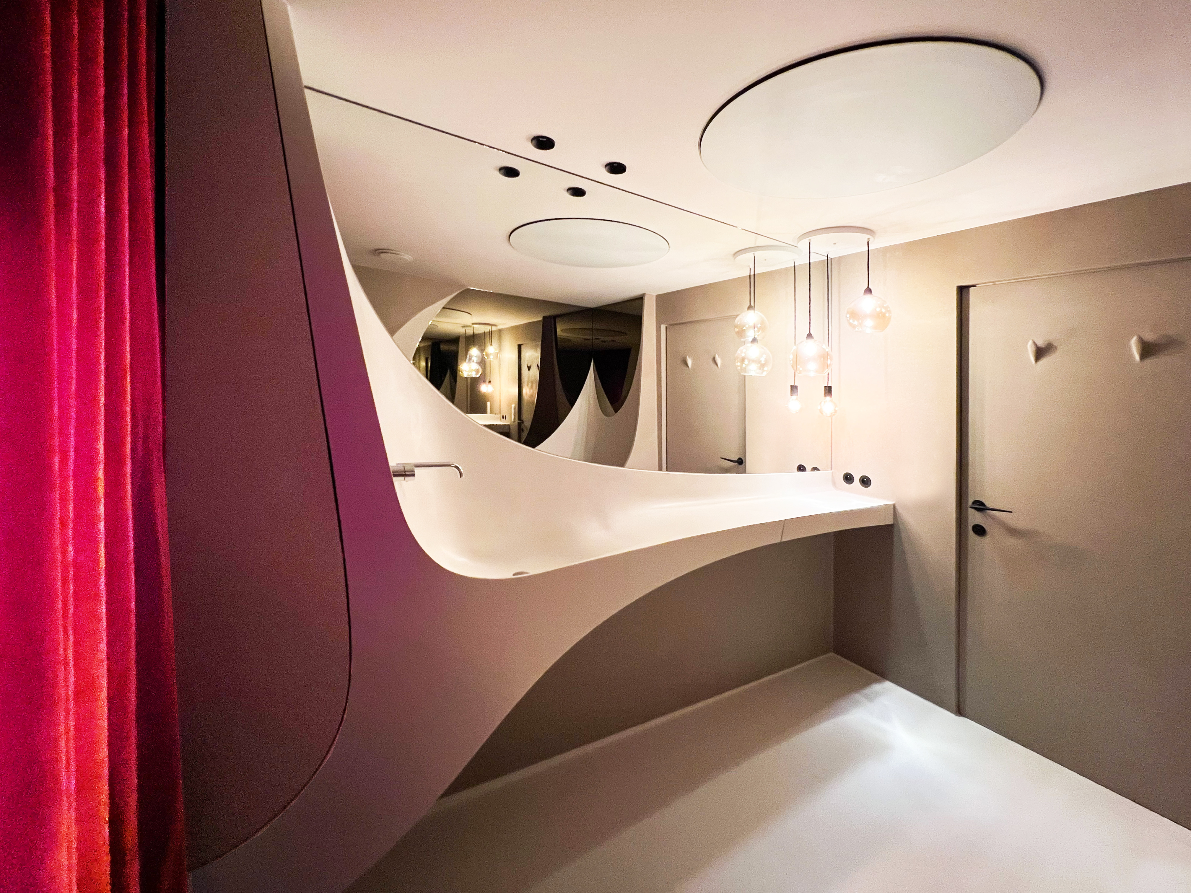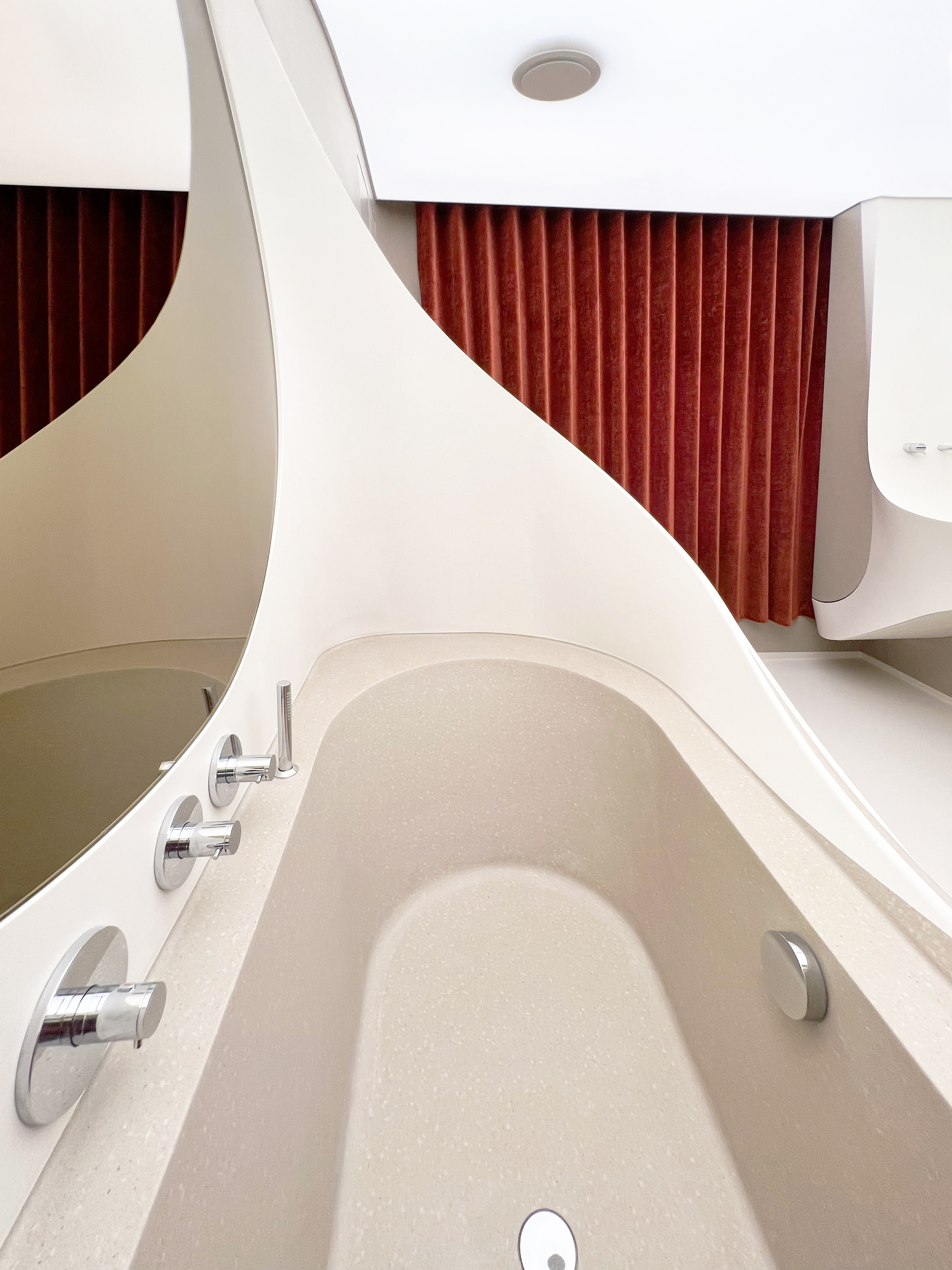 Monica: Vergeef het me, maar bij het ontwerp heb ik me laten gidsen door een rationele vrouwelijke afweging, zoveel mogelijk genieten en zo efficiënt mogelijk poetsen en onderhouden. Het ontwerp zelf ontstaat in co-creatie met de schetsers van NOIND en het interieurontwerpteam van Kletz. De inspiratie voor het lijnenspel, de vormgeving haal ik uit schilderijen, familieportretten uit Praag, gered tijdens de oorlog. De gestilleerde kaders projecteren zich in perfecte organische lijnen. Dit alles vormt zich tot een atypische tijdloze ruimte. Een cocon rond het bad is verfijnd maar ook praktisch, hij doet dienst als handgreep, de organische lavabo, mijn favoriete stuk, is onderaan vrijgemaakt en toegankelijk voor een rolstoel. Het modulaire concept is voorbereid om binnen 15 jaar te moduleren tot een zorgdouche.